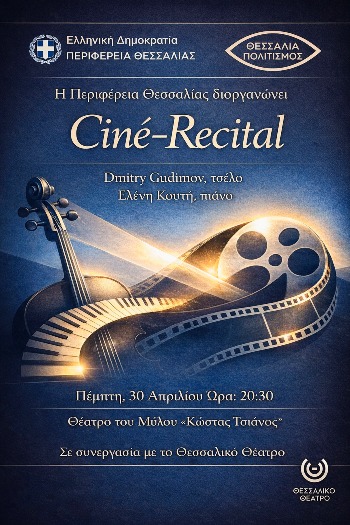 Η Περιφέρεια Θεσσαλίας και η Π.Ε. Λάρισας διοργανώνουν τη συναυλία «Πάμε Σινεμά! Cine-Recital», με προσκεκλημένους καλλιτέχνες το σύνολο Vernissage, που αποτελείται από τους Dmitry Gudimov (τσέλο), Ελένη Κουτή (πιάνο) και Νικόλαο Έξαρχο (ενορχήστρωση, τεχνικά μέσα, αφήγηση) σε συνεργασία με το Θεσσαλικό Θέατρο.