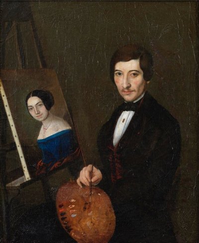 Ελένη Μπούκουρη-Αλταμούρα, Αυτοπροσωπογραφία με ένδυμα ανδρός, ζωγραφίζοντας την Τζέιν Μπέναμ Χέυ, περίπου 1855, λάδι σε καμβά. Συλλογή Αρχείου Νεοελληνικής Τέχνης «Σοφία Λασκαρίδου»