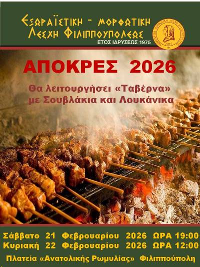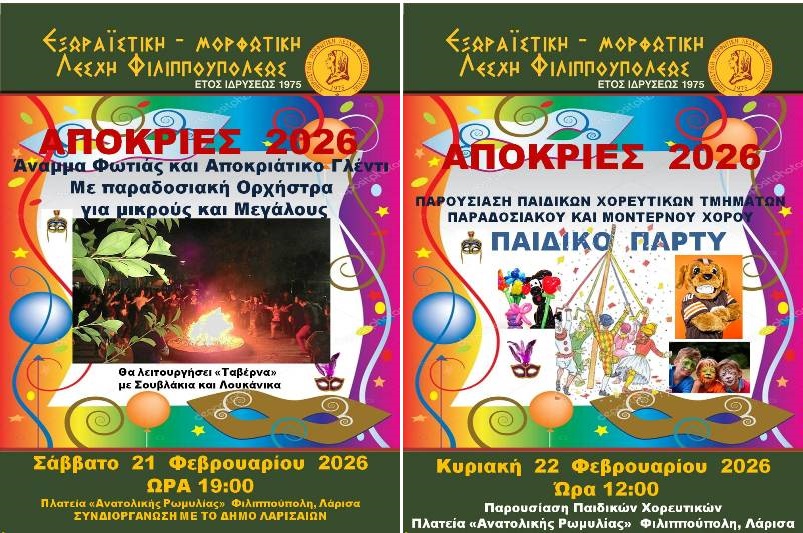 Η Ε.Μ.Λ. Φιλιππούπολης συνεχίζοντας για μια ακόμη χρονιά την παράδοση, διοργανώνει αποκριάτικες εκδηλώσεις στην πλατεία Φιλιππούπολης, έχοντας στόχο να κάνει τους συμμετέχοντες, μέσα από τα αποκριάτικα έθιμα, να γλεντήσουν και να περάσουν όμορφα.