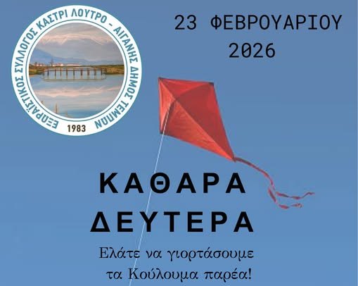 Ο Εξωραϊστικός Σύλλογος καστρί-Λουτρό διοργανώνει γιορτινή εκδήλωση για τον εορτασμό της Καθαράς Δευτέρας 23 Φεβρουαρίου 2026 στην κεντρική πλατεία του οικισμού και καλεί όλους τους κατοίκους.