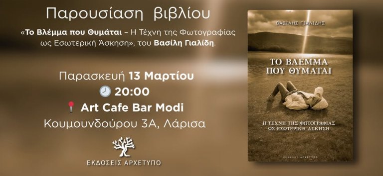 Οι Εκδόσεις Αρχέτυπο παρουσιάζουν στο Modi Art Cafe Bar το βιβλίο του Βασίλη Γιαλίδη ''Το βλέμμα που Θυμάται - Η τέχνη της φωτογραφίας ως εσωτερική άσκηση''.