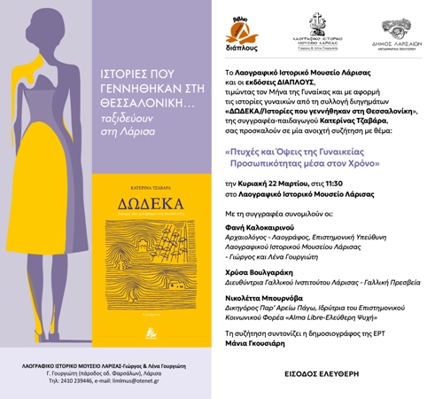 Με αφορμή το βιβλίο της Κατερίνας Τζαβάρα «Δώδεκα. Ιστορίες που γεννήθηκαν στη Θεσσαλονίκη», το Μουσείο και οι εκδόσεις Διάπλους διοργανώνουν μια ανοιχτή συζήτηση με θέμα «Πτυχές και Όψεις της Γυναικείας Προσωπικότητας μέσα στον Χρόνο», την Κυριακή 22 Μαρτίου, στις 11:30, στο Λαογραφικό Ιστορικό Μουσείο Λάρισας (Γ. Γουργιώτη, Πάροδος οδού Φαρσάλων).