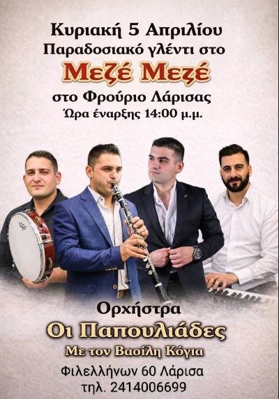 Την Κυριακή 5 Απριλίου το μεσημέρι ( 2 μ.μ.) το ''Μεζέ μεζέ'' ετοίμασε ένα παραδοσιακό live γλέντι με χορό στην άνετη πίστα του. Kαι με πολύ καλό φαγητό.