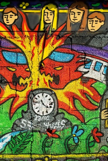 Εδώ η εικόνα μετατρέπεται σε μύθο. Οι δύο μηχανές σχηματίζουν κεφάλια δράκων, σαν ήρωες από προφορικές παραδόσεις, ενώ οι φλόγες δημιουργούν συμμετρικά μοτίβα που θυμίζουν εικόνισμα. Στον καπνό εμφανίζονται ανέκφραστα πρόσωπα, οι ψυχές των θυμάτων. Το ρολόι-μνήμα δείχνει την ώρα της τραγωδίας και γράφει «57 ΨΥΧΕΣ», ενώ από κάτω κυλά ο Πηνειός.