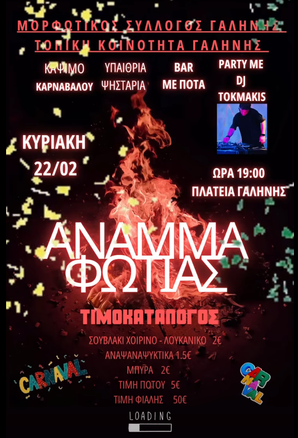 Ο Μορφωτικός Σύλλογος και η Τοπική Κοινότητα Γαλήνης δίνουν ραντεβού την Κυριακή 22 Φεβρουαρίου στις 19:00 στην Πλατεία Γαλήνης για το καθιερωμένο Άναμμα Φωτιάς και μια βραδιά γεμάτη αποκριάτικο κέφι.